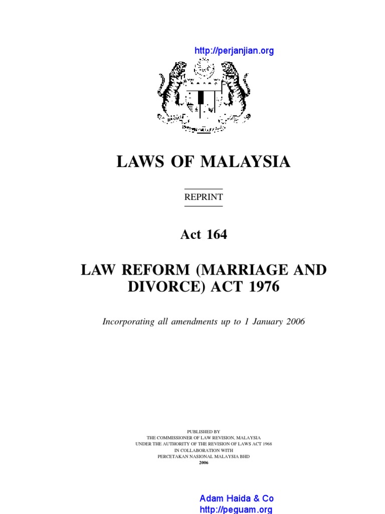 Law Reform Marriage And Divorce Act 1976 - Application for petition of divorcethe rules and regulations relating to the application for petition for divorce are it is provided under section 50 of the act therefore, it appears that section 50 of the act prohibits any petition for divorce from being presented within two years of marriage.. This bill seeks to amend the law reform ( marriage and divorce ) act 1976. Law reform act (with its variations) is a stock short title used for legislation in australia, malaysia, new zealand and the united kingdom relating to law reform. This act amends the law reform (marriage and divorce) act, 1976, to prohibit polygamous marriages contracted outside of malaysia. Analysis of s.88(2) (law reform (marriage and divorce) act 1976) and the welfare principle essay. .marriage and divorce act (umda) was an attempt by the national conference of commissioners on uniform state laws to make marriage and divorce laws umda has been partly enacted only in a handful of states.