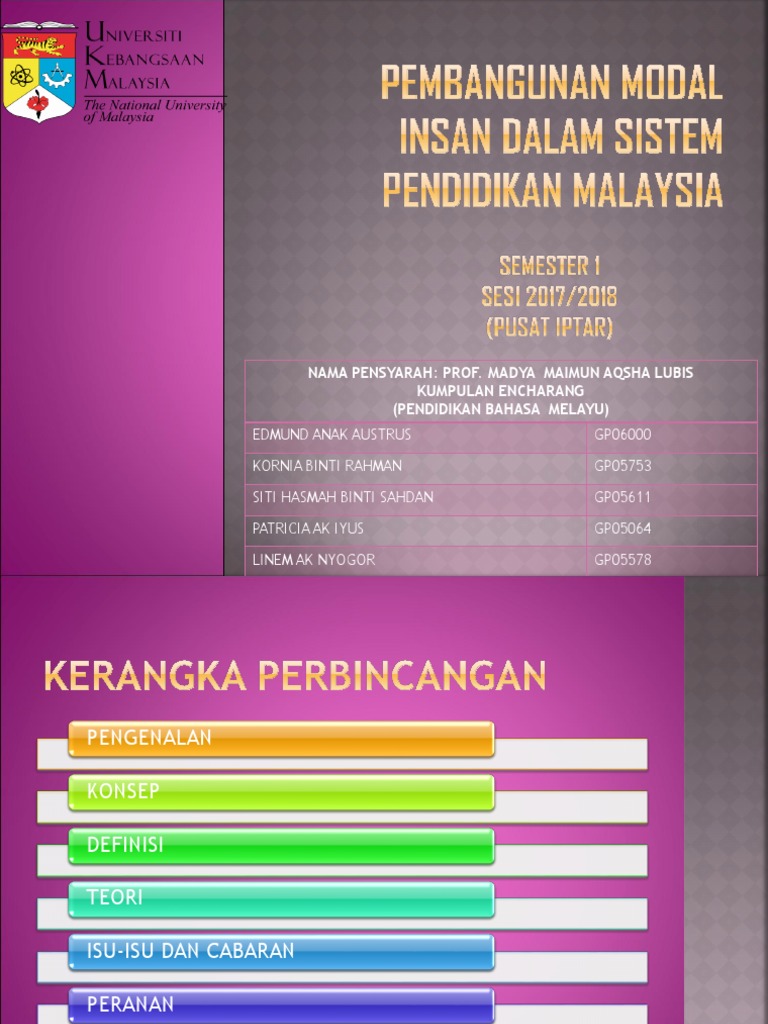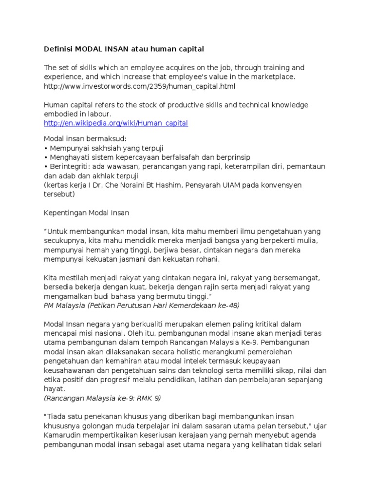 1 perkembangan profesional ke arah pembangunan modal insan guru nor hasnida che md ghazali effandi hj zakaria nidacmg@yahoo.com fakulti pendidikan, universiti kebangsaan malaysia abstrak kertas konsep ini bertujuan untuk membincangkan. Pembangunan kapasiti dan pembangunan modal insan. Faktor pembangunan modal insan • kualiti tenaga kerja di malaysia semakinmerosot. Oleh kerana itu, pembangunan modal insan dalam konteks pengurusan islam bukan. Pembangunan modal insan di malaysia: