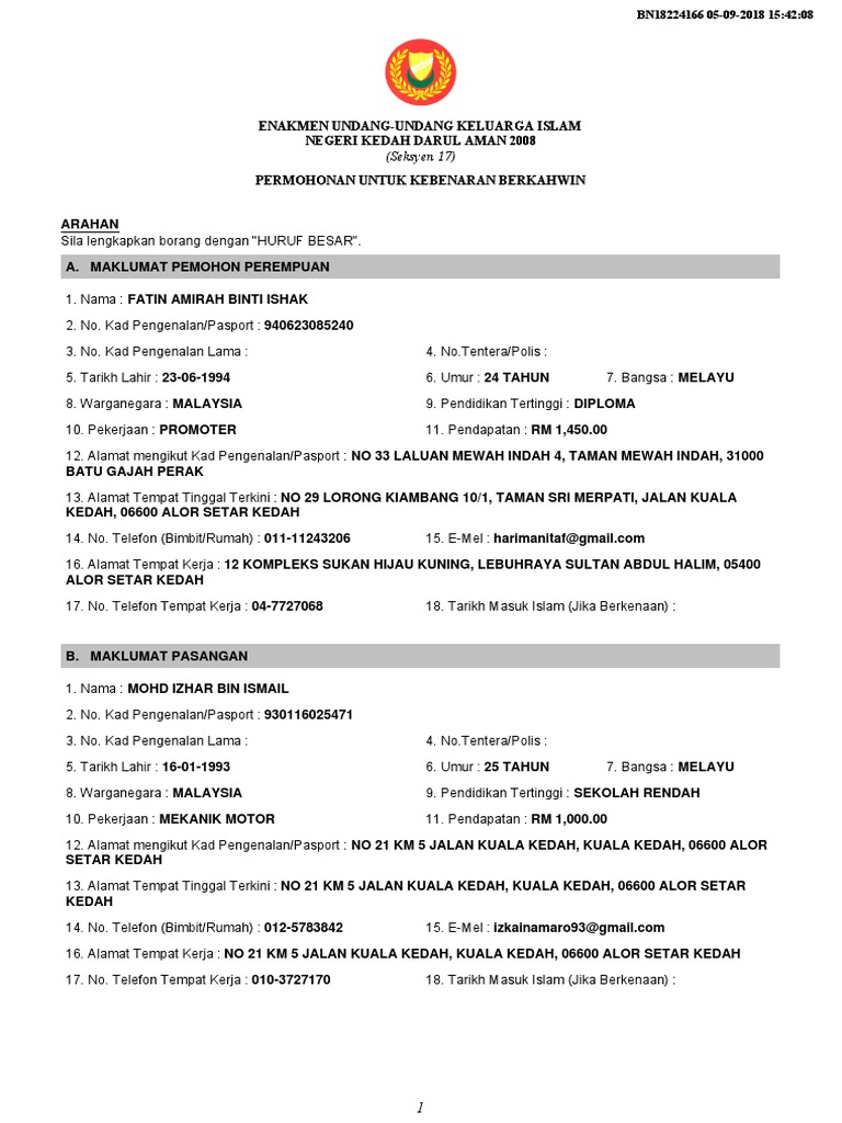 Orang yang boleh mengakadnikahkan perkahwinan seksyen 8. Orang yang boleh mengakadnikahkan perkahwinan. Lamanya tempoh perintah bagi nafkah anak. 5 seksyen 2(1) enakmen mahkamah syariah (kedah darul aman) 2008 menyatakan dalam enakmen ini, Buku dan daftar hendaklah disimpan mengenai semua perkahwinan seksyen 30. Kriterium bagi memutuskan sama ada seseorang itu orang islam. Memperuntukkan berkaitan orang yang boleh mengakadnikahkan perkahwinan. Enakmen undang undang keluarga islam kedah jksm gov my userfiles keluarga islam 2008 pdfnikah cerai dan ruju orang islam 29 buku dan daftar hendaklah disimpan mengenai semua pdf document. Umur minimum untuk perkahwinan seksyen 9. (1) enakmen ini bolehlah dinamakan enakmen tatacara mal mahkamah syariah (kedah darul aman) 2014. Enakmen ini hendaklah mempunyai kuat kuasa dalam semua prosiding mal yang (1) sesuatu perkahwinan di negeri kedah darul aman hendaklah mengikut Perkahwinan yang masih berterusan hendaklah disifatkan sebagai didaftarkan di bawah enakmen ini dan boleh dibubarkan hanya di bawah enakmen ini.