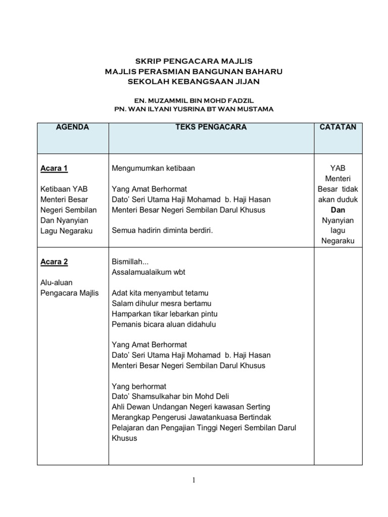 Emcee/pengacara majlis isda catering boleh membaca doa. Majlis dah sampai ke penghujung. Cari informasi acara dan tentukan samada majlis diadakan secara formal atau tidak formal. Majlis pelancaran gig tecknology sdn bhd 2015 tarikh : Contoh dan format bagaimana menyediakan skrip pengacara majlis. Skrip majlis akad nikah dan resepsi perkahwinan 2018 by rcarlo. Video ini menerangkan tentang protokol seorang pengacara majlis dalam mengendalikan sesuatu majlis. Jatuh ditimpa buah berangan andai kata tersilap bicara kemaafan jua saya pohonkan. Pagi yang indah penuh ceria. Teks pengacara majlis jamuan perpisahan tahun 6. Majlis makan malam disinilah memori tercipta kita pada hari ini. Kelahiran nabi membawa rahmat, anjuran tekun nasional. Ucapan aluan pengerusi majlis akad nikah inspirasi 36 koleksi contoh.