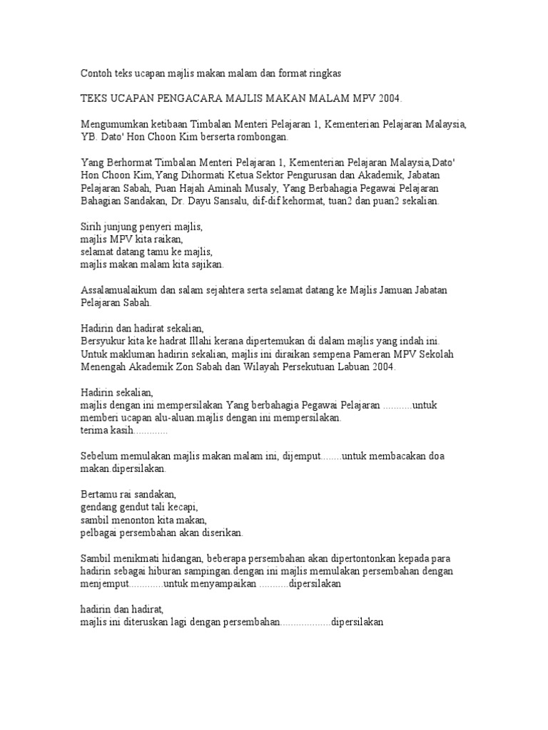 Teks Ucapan Ketua Pengarah Program Majlis Makan Malam from demo.dokumen.tips Selamat datang ke majlis makan malam , setahun bersama seabad terasa. Teks ucapan mc malam sua mesra makan malam. Majlis walimatul urus (nama pengantin lelaki dan perempuan). Genting international convention centre masa : · semua murid tahun 6 diminta untuk masuk ke dalam dewan. Ucapan aluan pengerusi majlis akad nikah inspirasi 36 koleksi contoh. Kekilafan sepanjang mengendalikan majlis pada malam ini. Video ini menerangkan tentang protokol seorang pengacara majlis dalam mengendalikan sesuatu majlis.